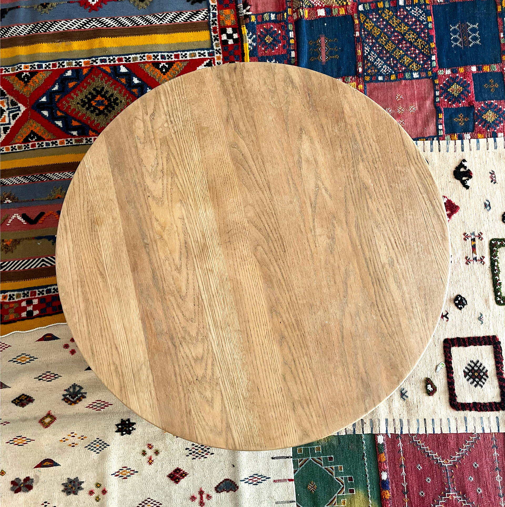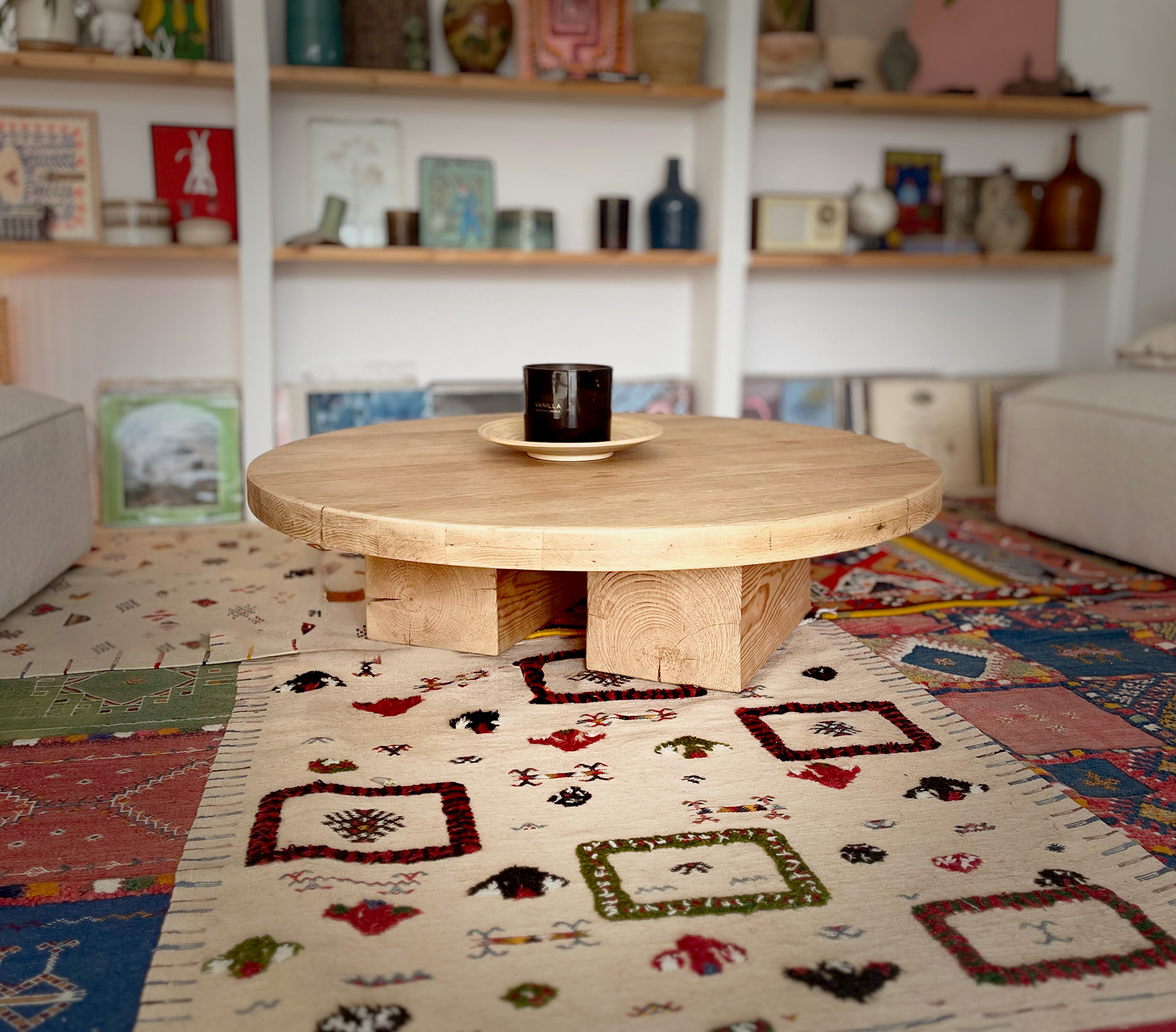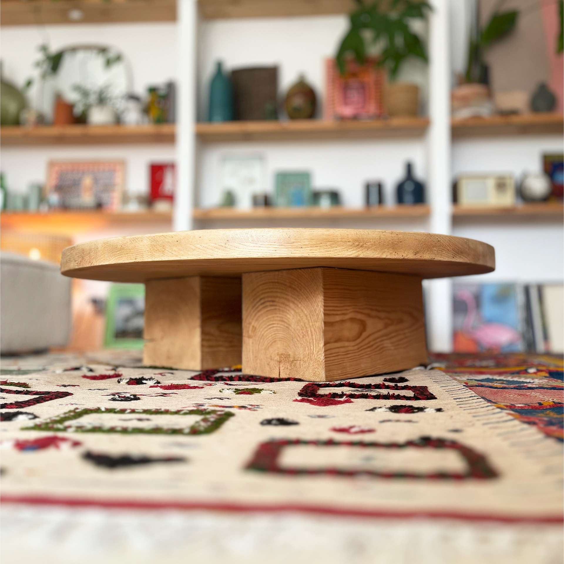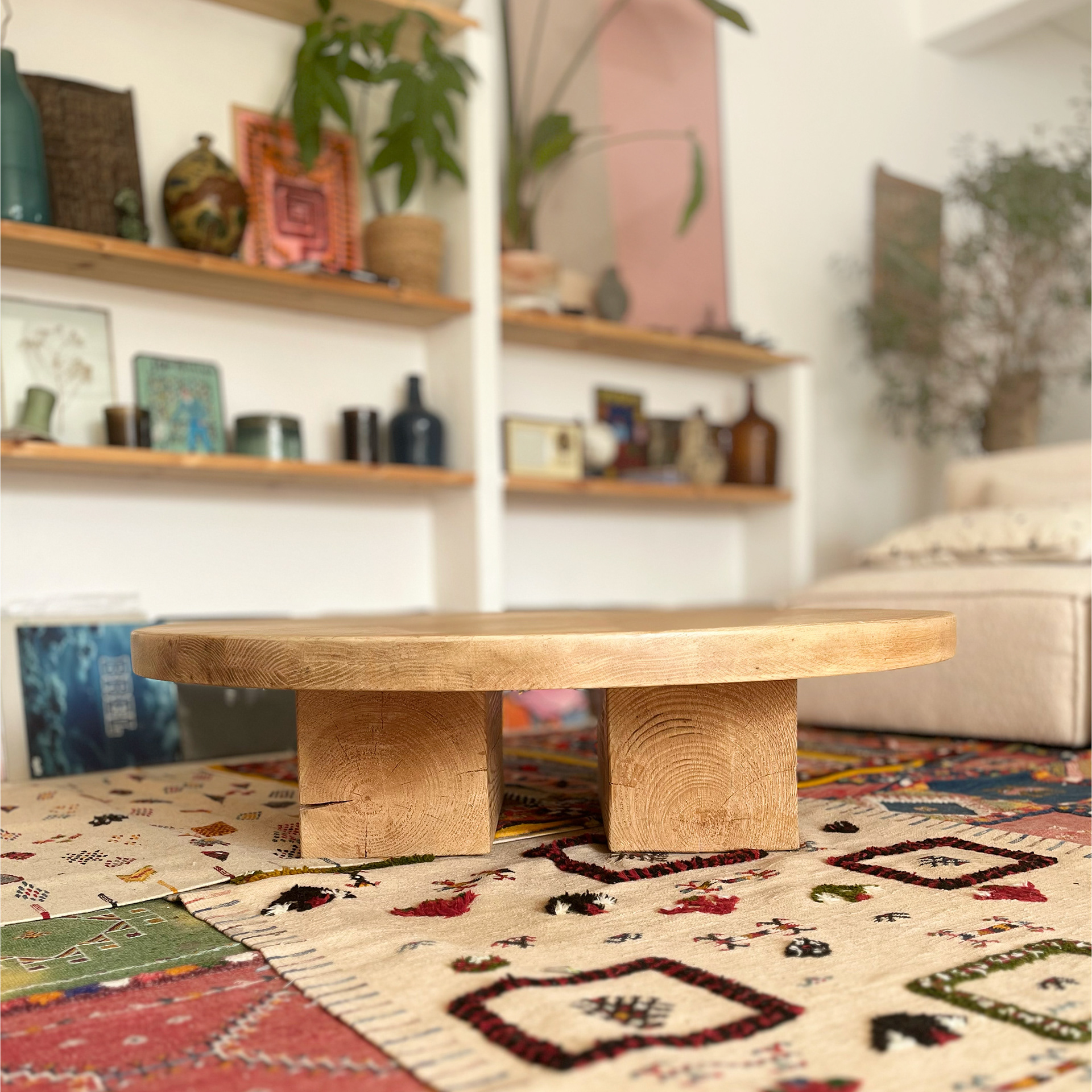 Table basse ronde en châtaignier massif avec deux pieds en blocs, offrant un design simple et brut.