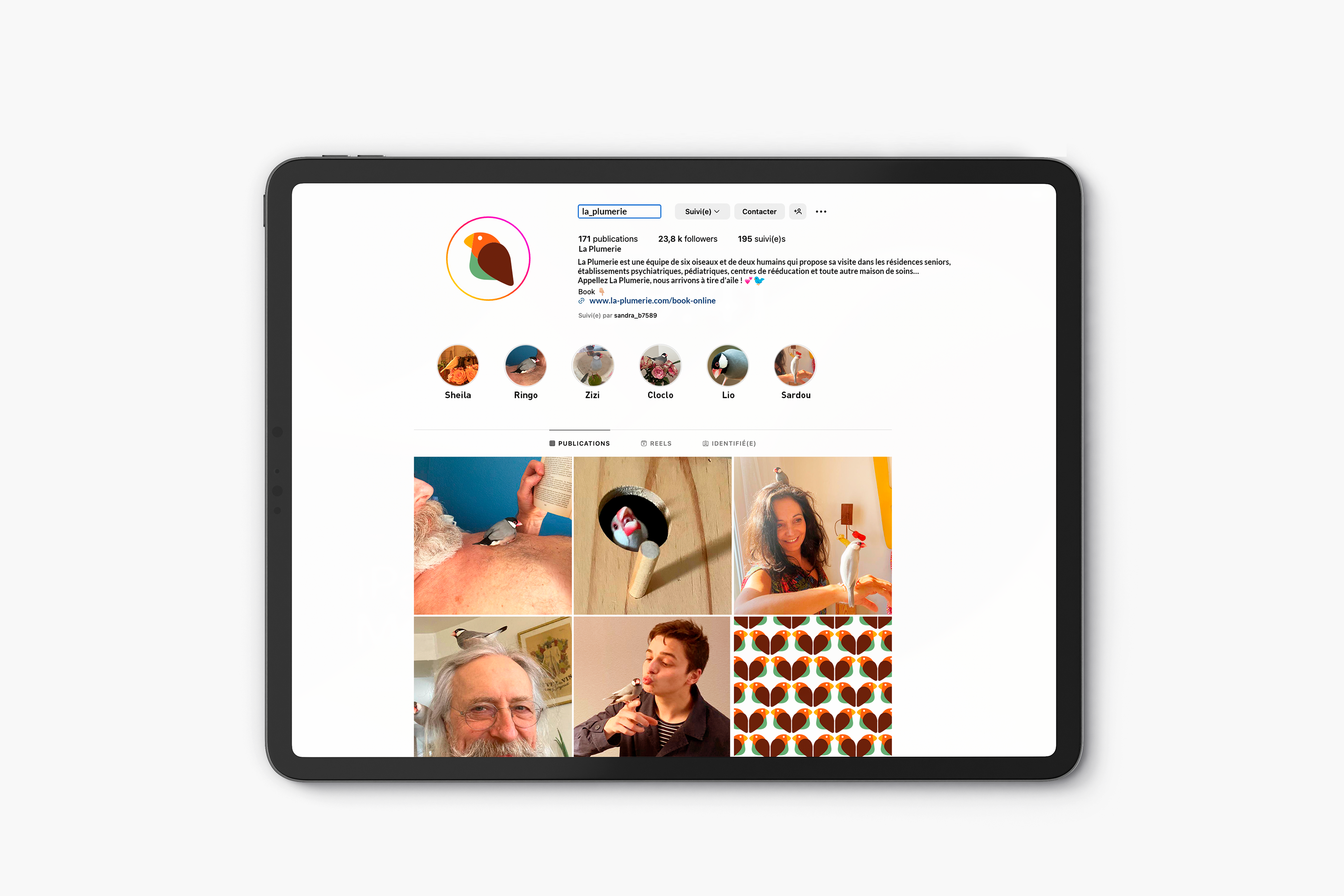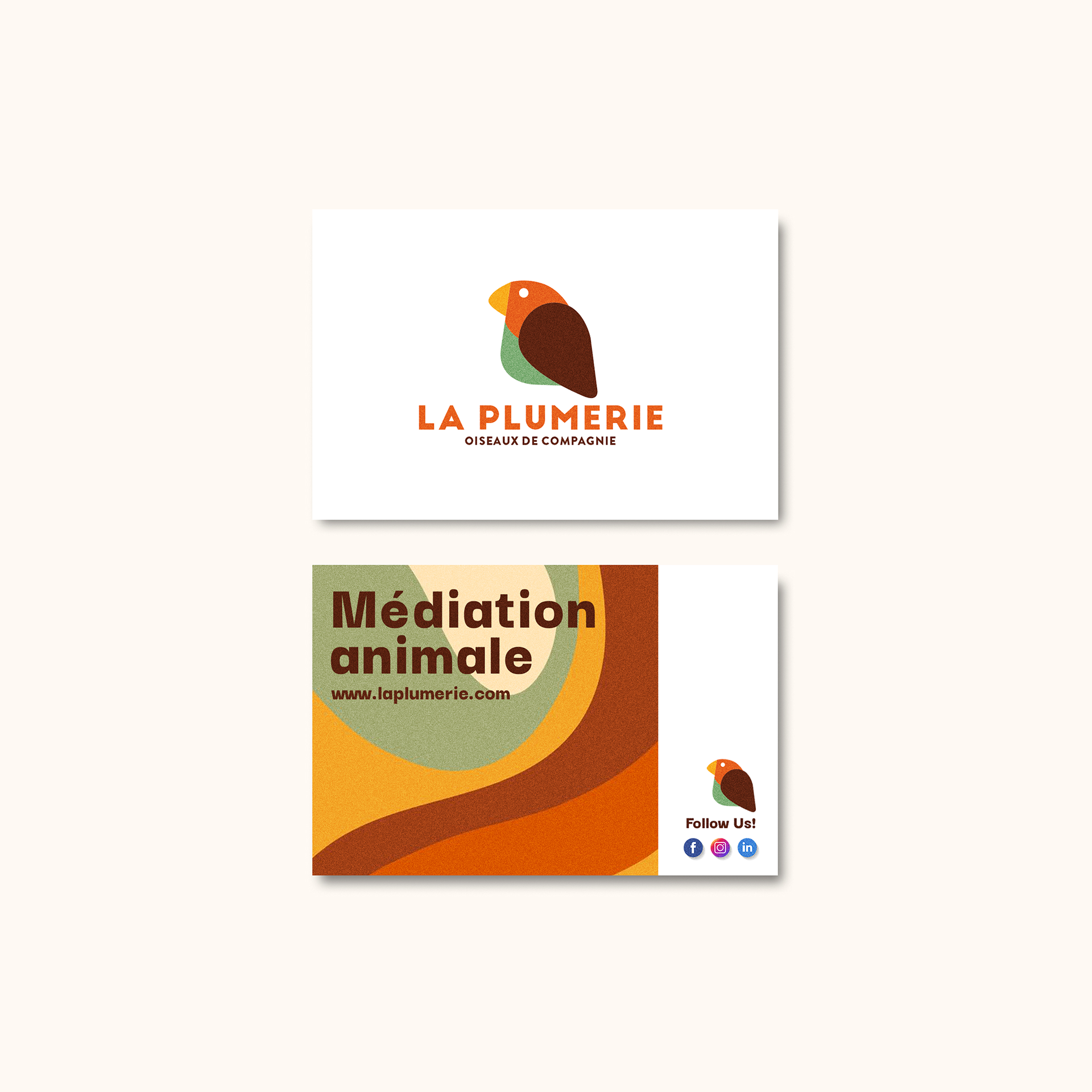 Identité visuelle de La Plumerie, médiation animale par des oiseaux en établissements de soins.